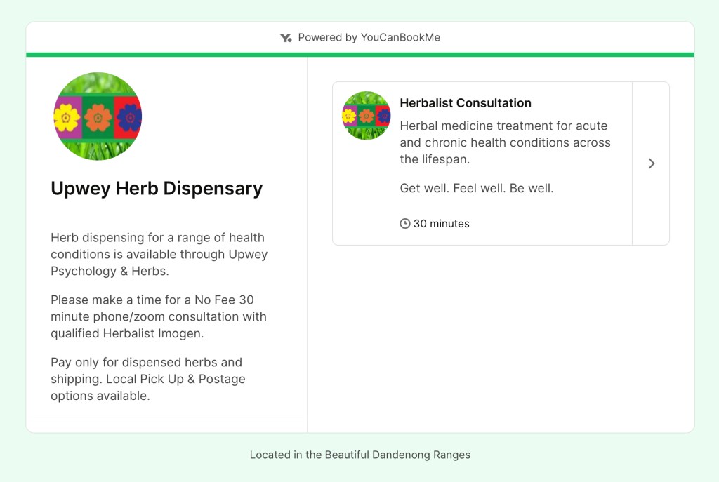 Please choose a time for a no fee online 30 minute consultation with qualified Herbalist Imogen. Pay only for dispensed herbs, postage and shipping.